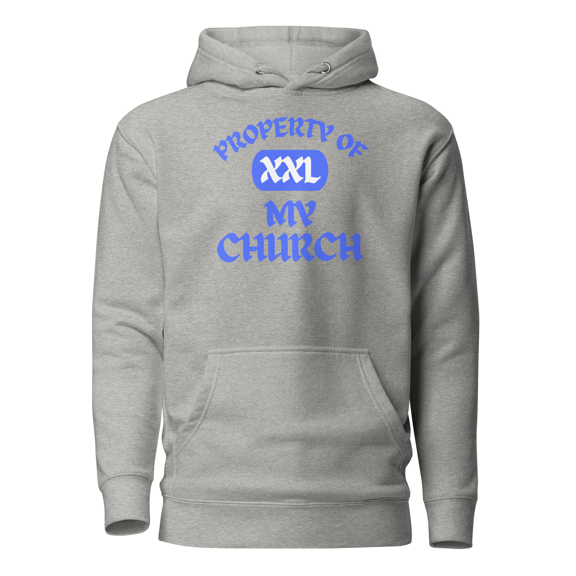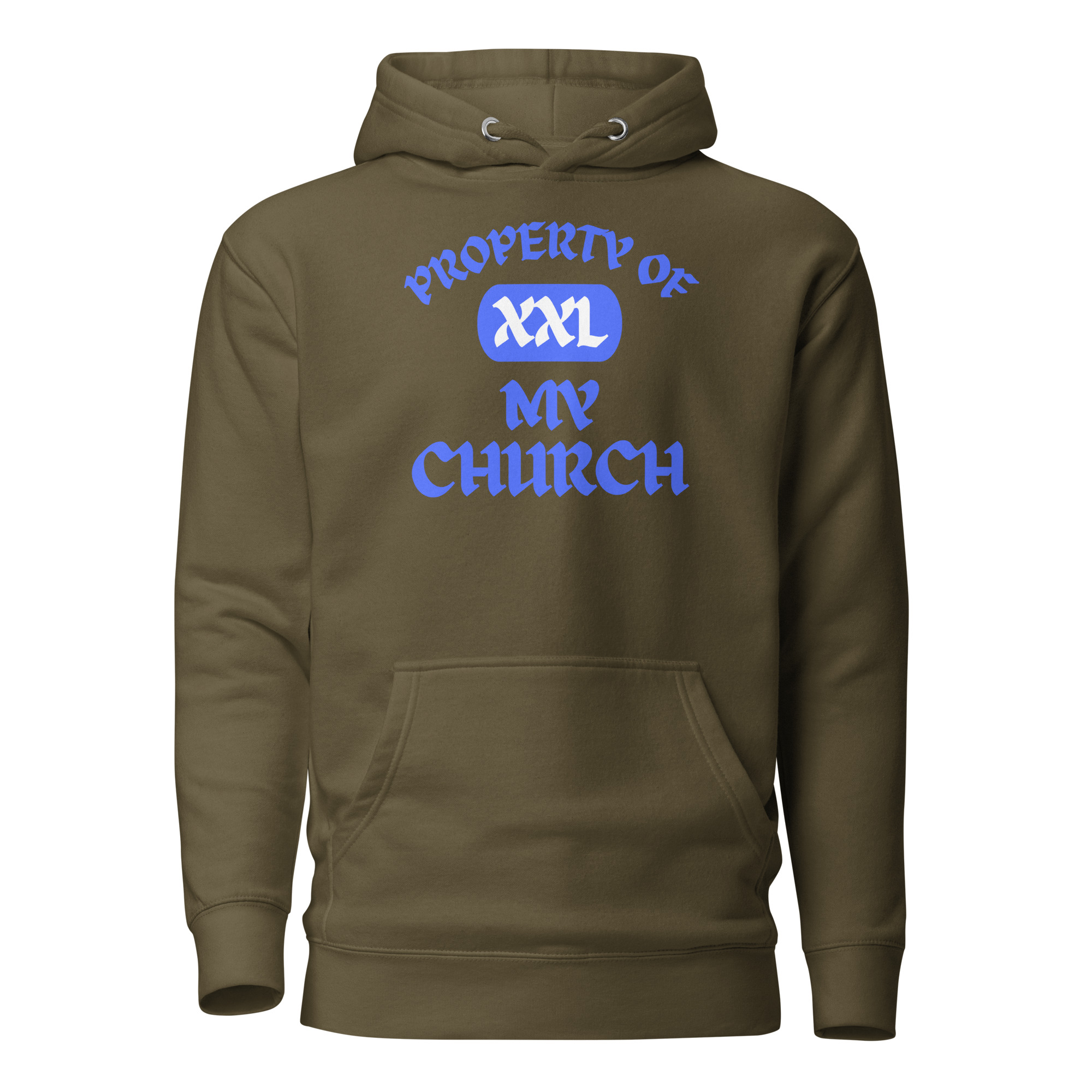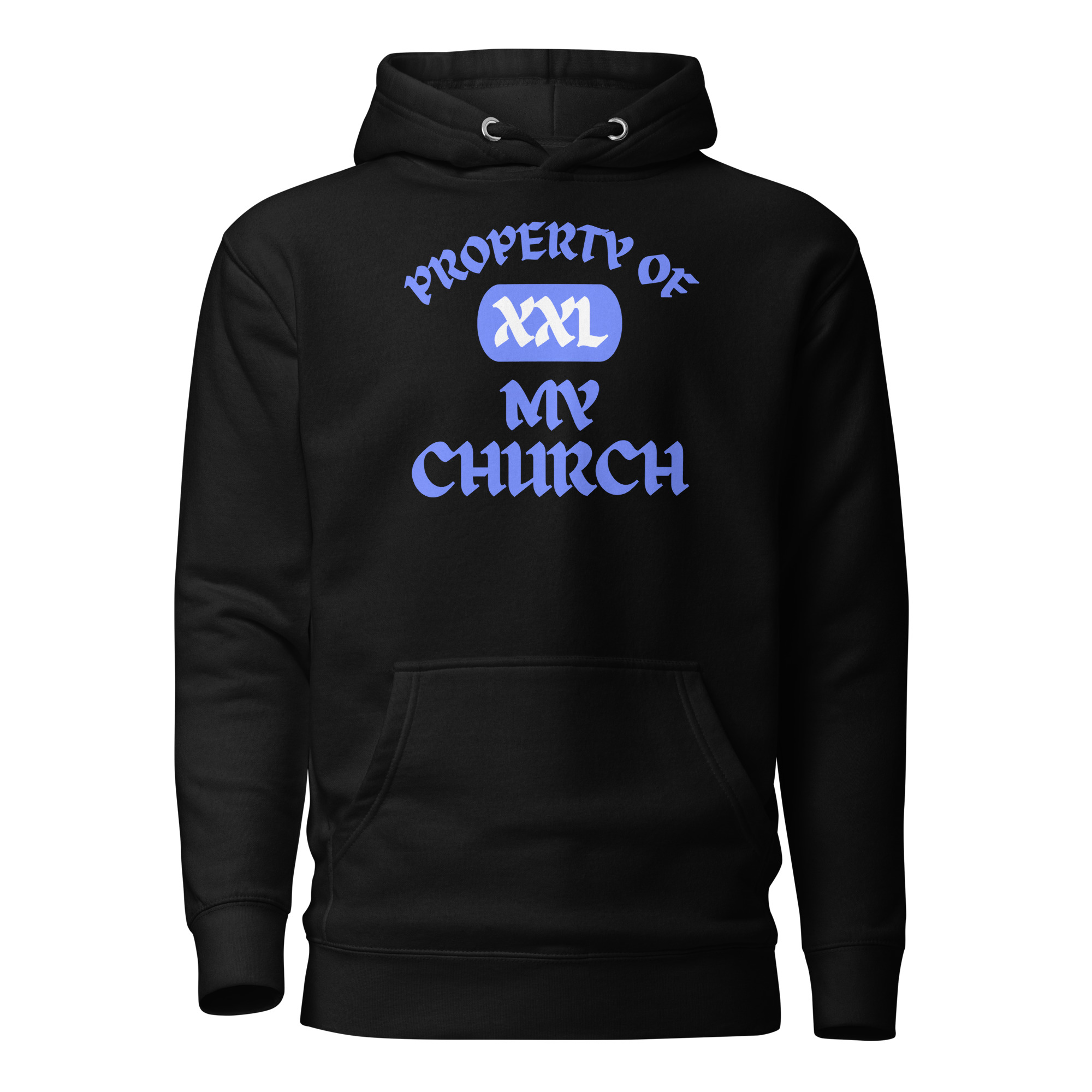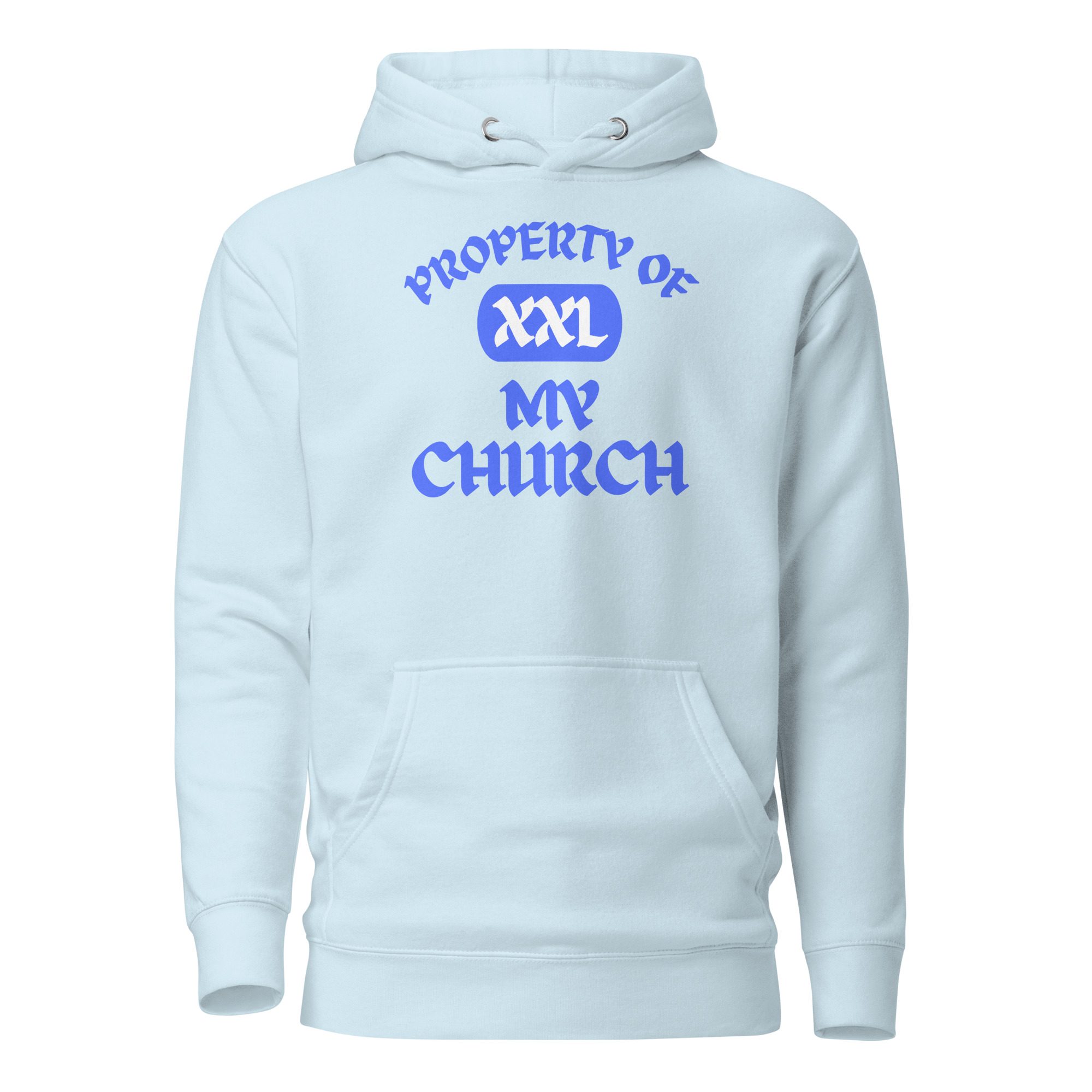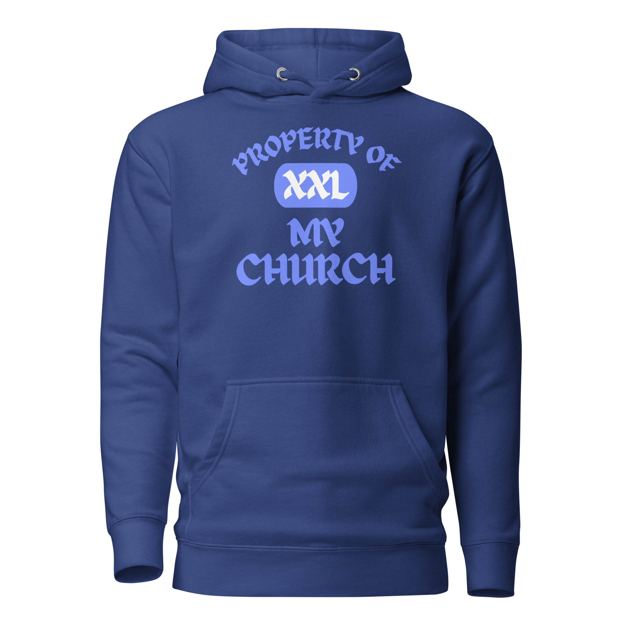 Unisex Hoodie Property-Of-The-Church-Celandine-in-Royal-Blue-Letters