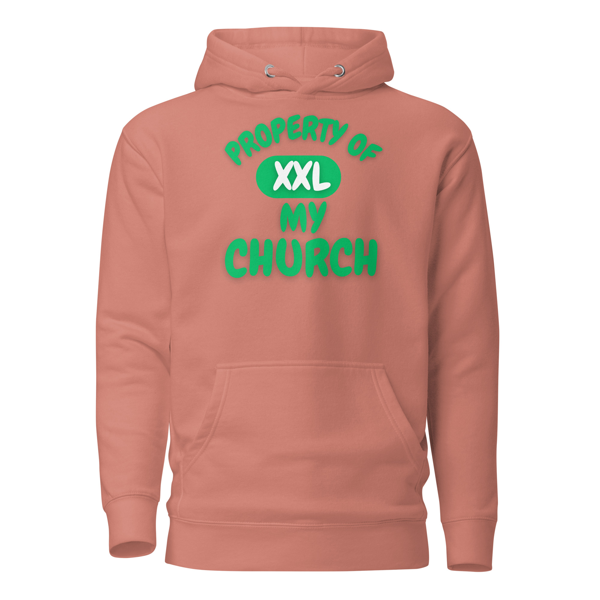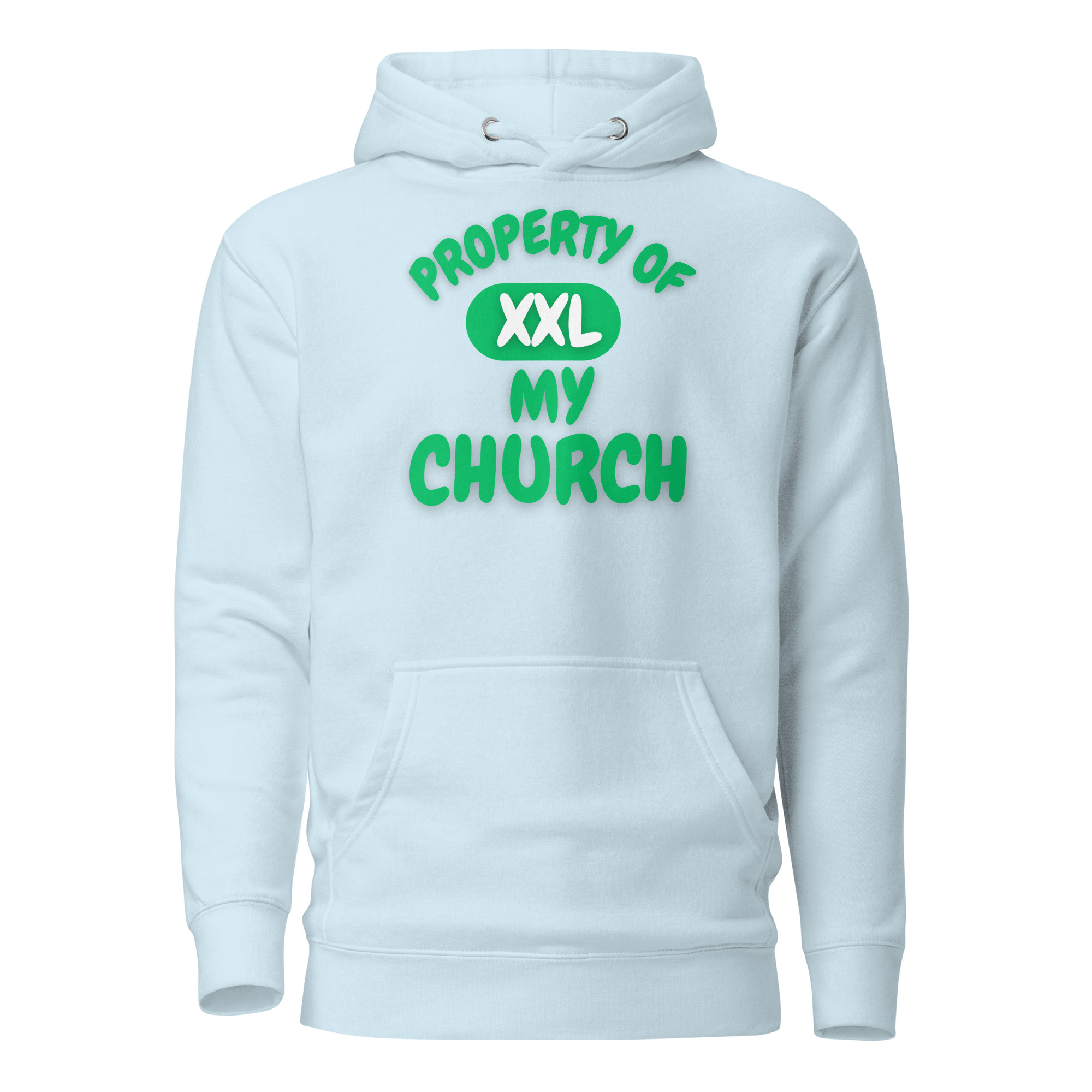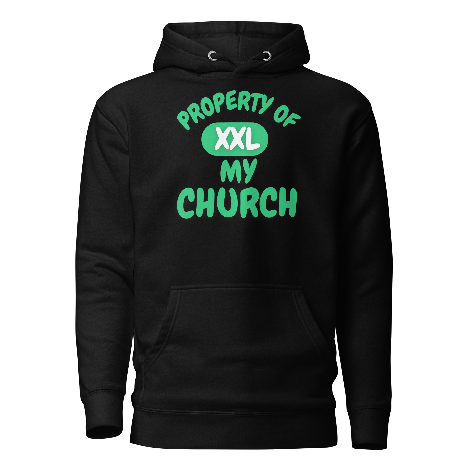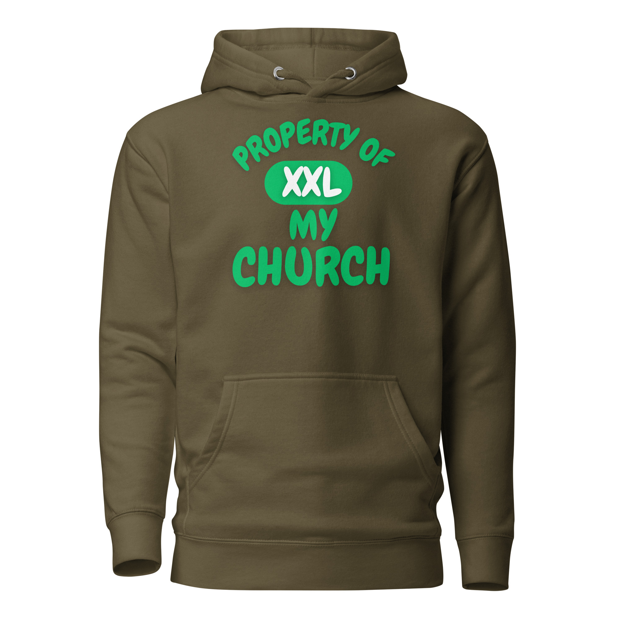 Unisex Hoodie Property-Of-The-Church-Chewy-in-Green-Letters