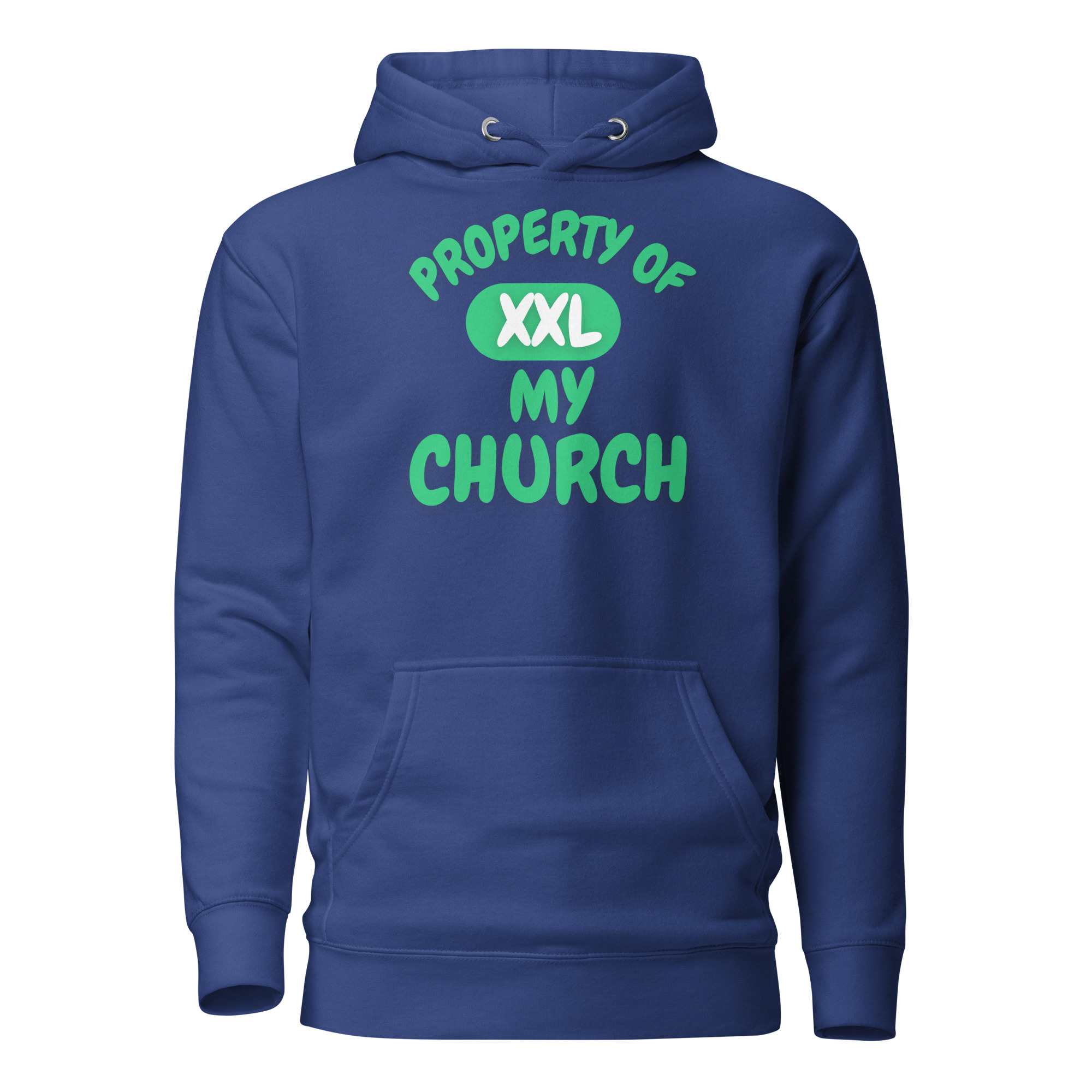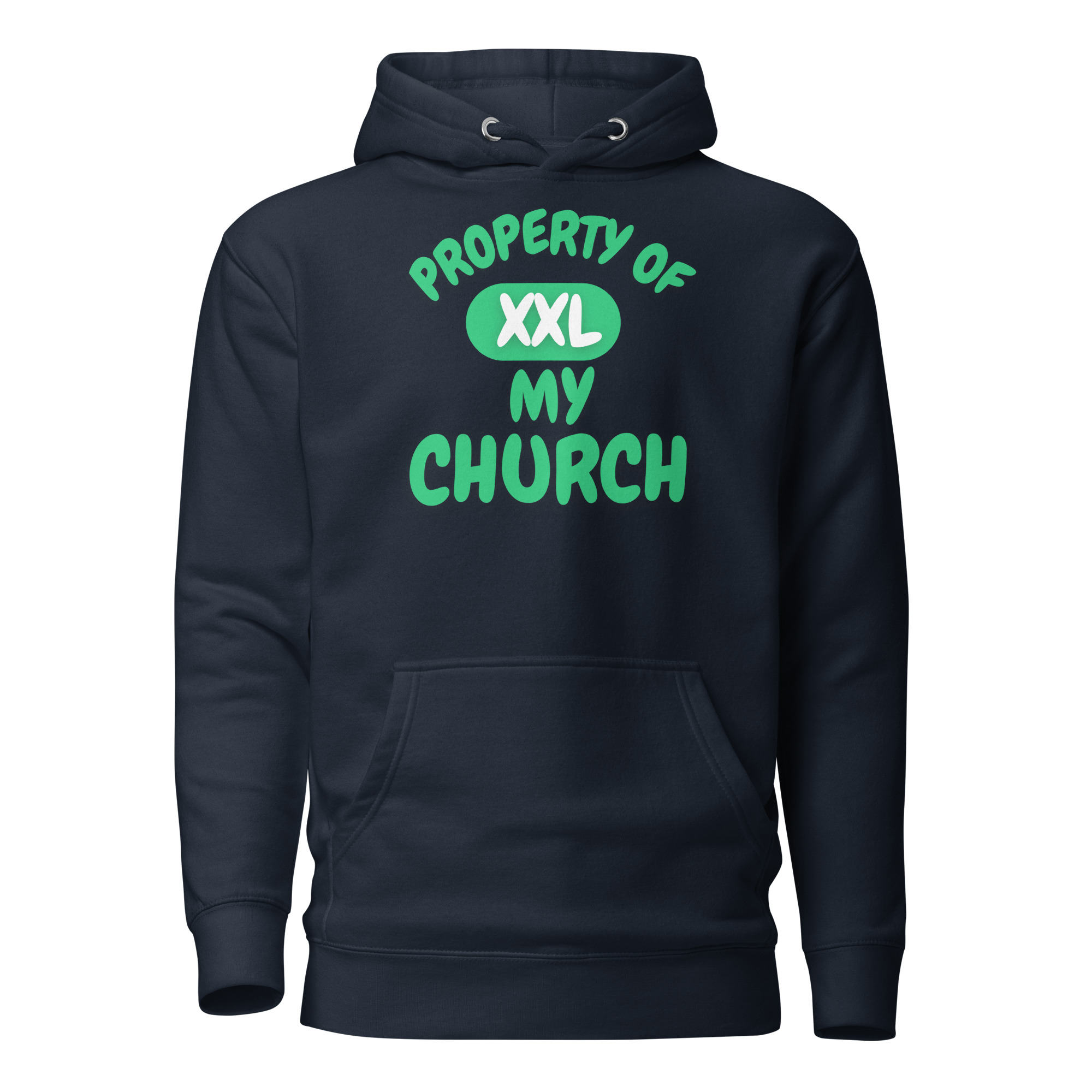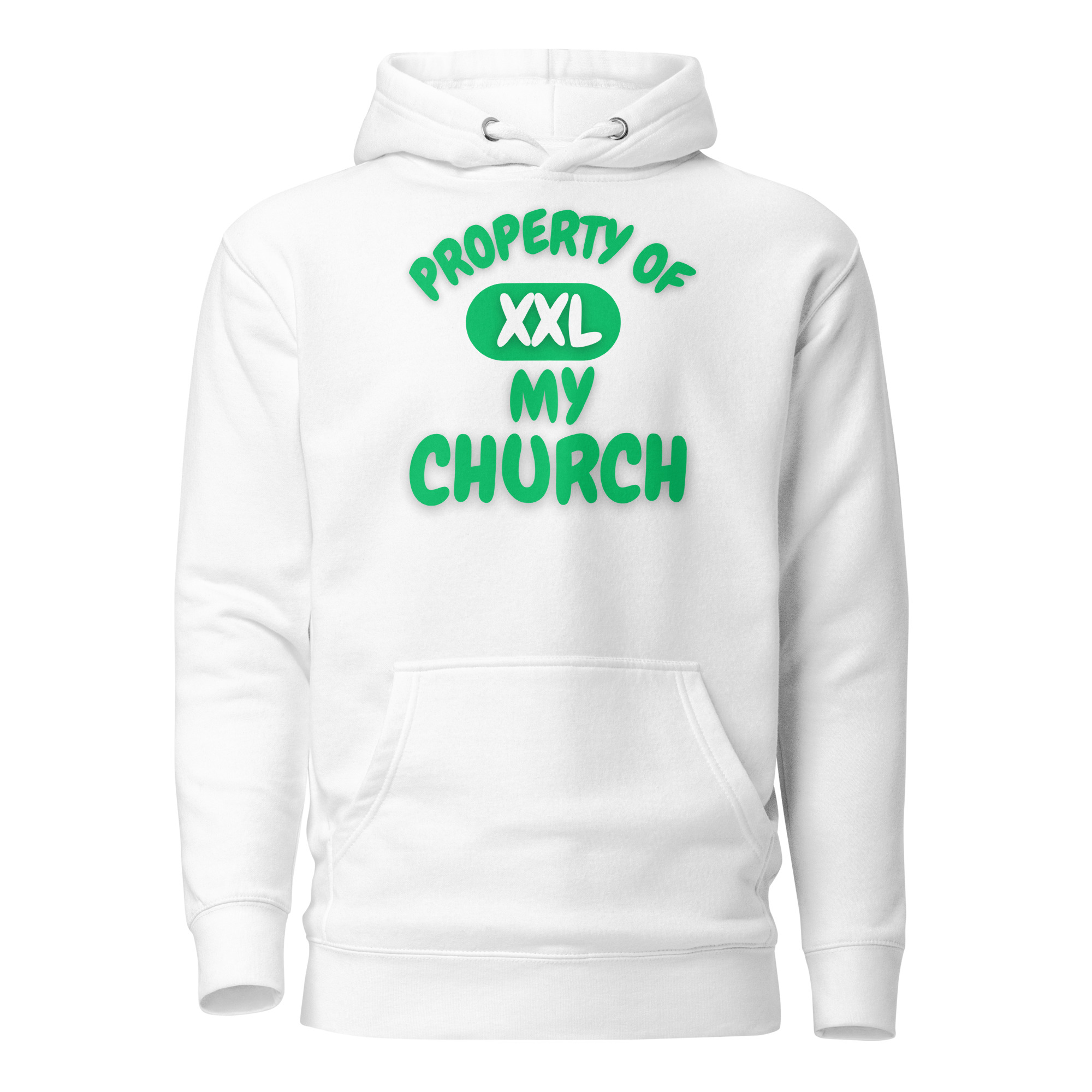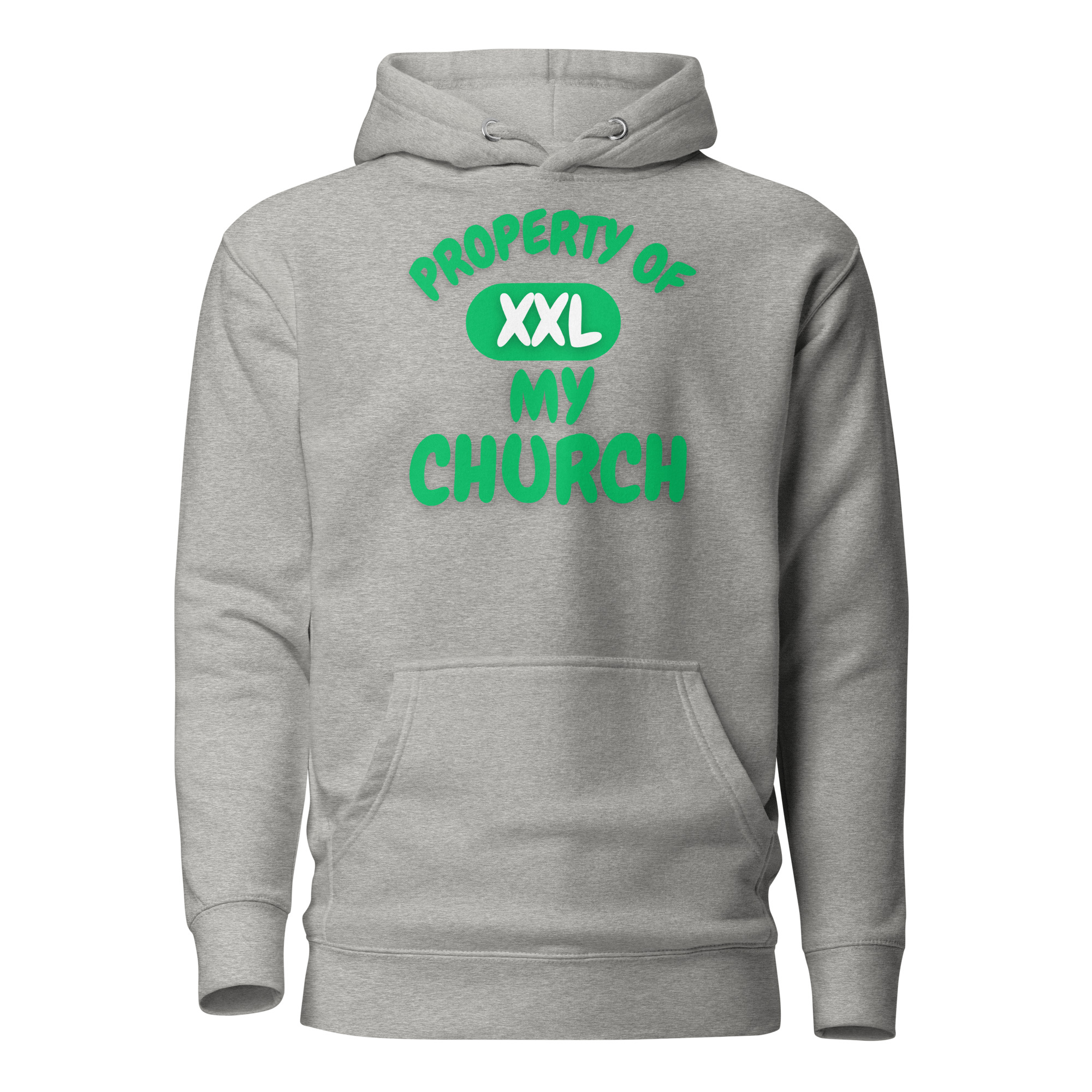 Unisex Hoodie Property-Of-The-Church-Chewy-in-Green-Letters